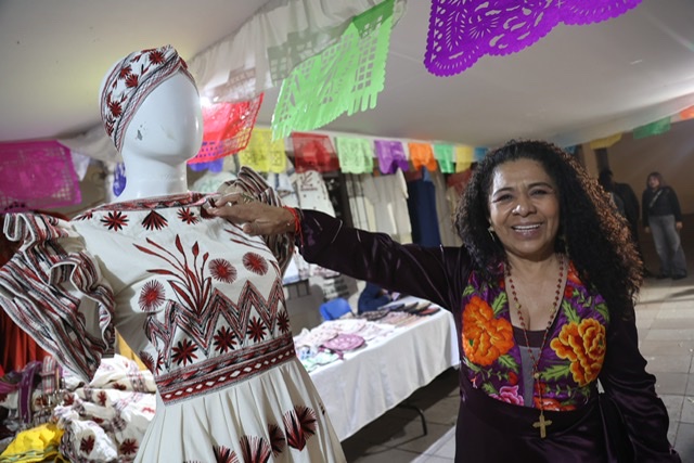 Entre los artesanos que participan en esta feria se encuentra Jovita Osorio Santiago, quien elabora vestidos y blusas bordadas a mano en punto de cruz, ella se ha dedicado a esta actividad por casi 45 años.