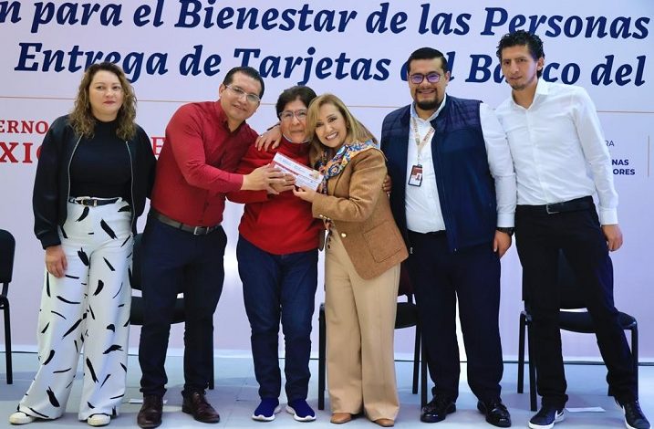 La mandataria estatal entregó tarjetas de Pensión para el Bienestar a los beneficiarios Juan Antonio Sánchez Rojas, Margarita Flores Bravo, Leonor Pérez Jiménez, Margarita Tenoceno Serrano, Juana García Juárez y Daniel Muñoz Ipatzi.