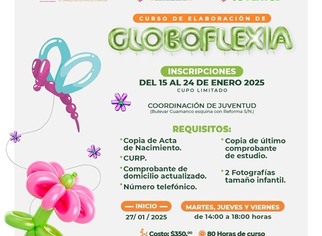 Tlax Ene 2025.- La Coordinación de Juventud de Huamantla, en colaboración con el Instituto de Capacitación para el Trabajo del Estado de Tlaxcala (Icatlax), invita a todos los jóvenes del municipio a inscribirse en el curso de Globoflexia, que iniciará el próximo 27 de enero.