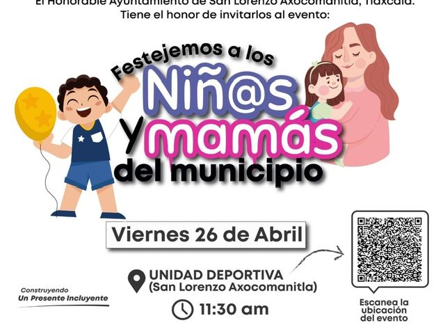 Alondra Morales | ZRST | Tlx 2024.-El Honorable Ayuntamiento de San Lorenzo Axocomanitla, Tlaxcala, extiende una cordial invitación a todos los habitantes del municipio a un evento especial dedicado a los niños y mamás. Bajo el lema «Restejemos a los Niñ@s y Mamás del Municipio: Construyendo un Presente Incluyente», esta jornada promete ser un espacio de alegría y unión para toda la comunidad.