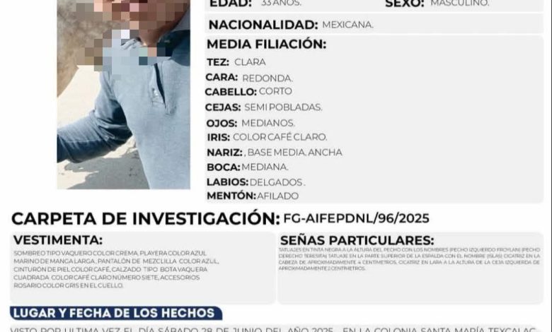 Luis Alfredo Pérez | ZRST | Tlax Jul 2025.- Paulino N., de 33 años, fue visto por última vez el 28 de junio en la colonia Santa María Texcalac, municipio de Apizaco, Tlaxcala, y su cuerpo fue hallado sin vida el 12 de julio en el municipio de Tetla, Tlaxcala.