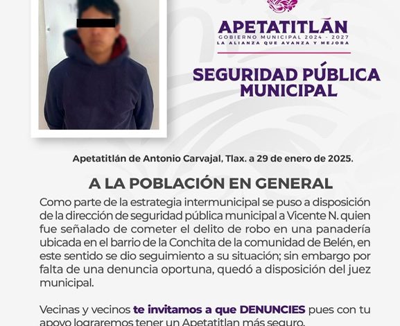 Marina Valencia | ZRST | Tlax Feb 2025.- Como parte de la estrategia intermunicipal para combatir la delincuencia, la Dirección de Seguridad Pública Municipal de Apetatitlán ha tomado acciones importantes en la lucha contra la delincuencia . En esta ocasión, se puso a disposición de las autoridades judiciales a Vicente N., quien fue señalado por presuntamente cometer el delito de robo en una panadería ubicada en el barrio de la Conchita, en la comunidad de Belén.