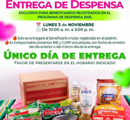 El Sistema Municipal para el Desarrollo Integral de la Familia (SMDIF) Huamantla informa que el próximo lunes 3 de noviembre se realizará la entrega de despensas correspondientes al mes de noviembre, en un horario de 10:00 a.m. a 3:00 p.m., exclusivamente para los beneficiarios registrados en el padrón 2025 del Programa de Asistencia Social Alimentaria.
