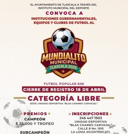 Este sábado 18 de abril concluye el periodo de inscripción para participar en el torneo de futbol popular 6×6 “Mundialito Municipal”, organizado por el Ayuntamiento de Tlaxcala para promover la actividad física, la convivencia social y la participación de jóvenes y ciudadanía en general.