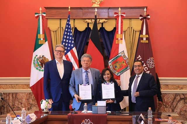 Tlax Nov 2024.- La gobernadora Lorena Cuéllar Cisneros, el director general adjunto de la Cámara México-Alemana de Comercio e Industria, Andreas Müller y el director general del Núcleo de Investigación Científica y Desarrollo Tecnológico (Nicdet), José Luis Rubio Pino, firmaron el Memorándum de entendimiento para la cooperación y educación dual científica para el trabajo, habilidades, alta tecnología, sustentabilidad, movilidad e investigación en ciencia y tecnología, el cual, además de fortalecer la formación profesional de los jóvenes tlaxcaltecas, asegurará su acceso a mejores empleos y mejor remunerados.