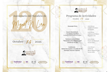 Tlax Oct 2025.- En el marco de la conmemoración de los 500 años de la Fundación de la Ciudad de Tlaxcala, y con motivo del 120 aniversario del natalicio del escritor Miguel N. Lira, el Gobierno del Estado llevará a cabo una jornada cultural conmemorativa el próximo 14 de octubre de 2025, con actividades abiertas al público que buscan rendir homenaje a su legado literario y promover la lectura entre nuevas generaciones.