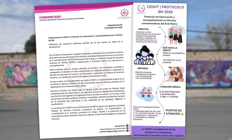 Con el objetivo de garantizar el respeto, protección y promoción de los derechos humanos de las personas que participan en las marchas y manifestaciones del 8 de marzo, en el marco de la conmemoración del Día Internacional de la Mujer, la Comisión Estatal de Derechos Humanos de Tlaxcala (CEDHT), implementará el Protocolo interno de intervención y acompañamiento.