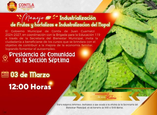 Entre los temas que se impartirán destacan el manejo de industrialización de frutas y hortalizas, así como la industrialización de procesos de nopal verdura, capacitaciones orientadas a agregar valor a la producción agrícola y fomentar nuevas alternativas de ingreso para las familias contlenses.