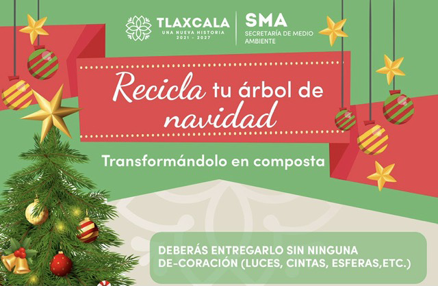 Tlax Ene 2025.- La Secretaría de Medio Ambiente del Estado (SMA) realizará la campaña “Recicla tu Árbol de Navidad” del 6 de enero al 24 de febrero 2025, con el objetivo de fomentar el reciclaje de los recursos naturales y la cultura ambiental por medio de la separación y reutilización de estos ejemplares en compostaje para la propagación de otras especies.