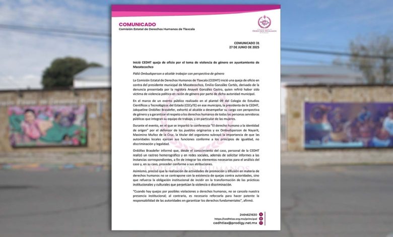 Tlax Jun 2025.- La Comisión Estatal de Derechos Humanos de Tlaxcala (CEDHT) inició una queja de oficio en contra del presidente municipal de Mazatecochco, Emilio González Cortés, derivado de la denuncia presentada por la regidora Anayeli González Castro, quien refirió haber sido víctima de violencia política en razón de género por parte de dicha autoridad municipal.