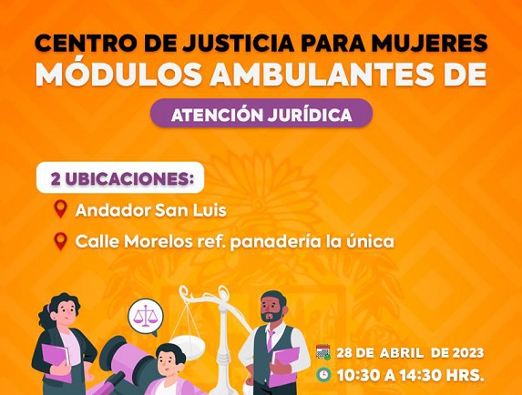 El Gobierno Municipal de Huamantla, que preside Salvador Santos Cedillo a través del Instituto Municipal de la Mujer, invitan a todas las huamantlecas este viernes 28 de abril a los Módulos Ambulantes de Atención Jurídica del Centro de Justicia para las Mujeres (CJM) del Estado de Tlaxcala, que estarán ubicados en el Andador San Luis y en la calle Morelos, a la altura de la Panadería “La Única”.