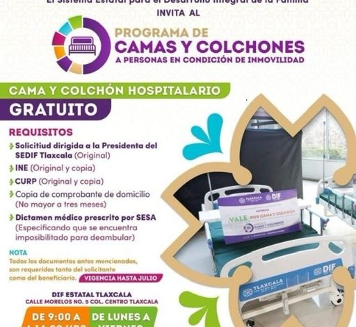Este programa se lleva a cabo en coordinación con el Sistema Estatal para el Desarrollo Integral de la Familia (SEDIF) Tlaxcala, y está dirigido a personas que requieren de un apoyo especial para su atención en casa y desean recibir una cama o colchón hospitalario adaptado a sus necesidades.