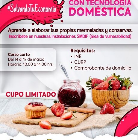 Con el objetivo de que las y los huamantlecos aprendan a preparar mermeladas y conservas, y con ello generar un ingreso económico, el Sistema Municipal para el Desarrollo Integral de la Familia (DIF) Huamantla, convoca al curso “Salvando tu economía con tecnología doméstica”, el cual se desarrollará del 14 al 17 de marzo.