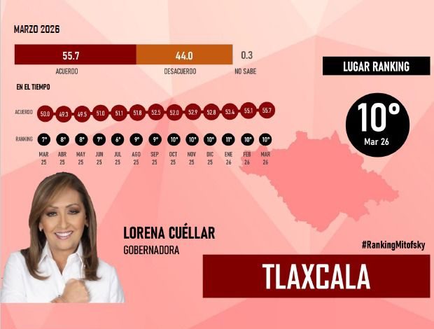 La gobernadora de Tlaxcala, Lorena Cuéllar Cisneros, se consolidó dentro del top 10 nacional de mandatarios estatales con mejor evaluación ciudadana, de acuerdo con el más reciente ranking de Consulta Mitofsky correspondiente a marzo de 2026.