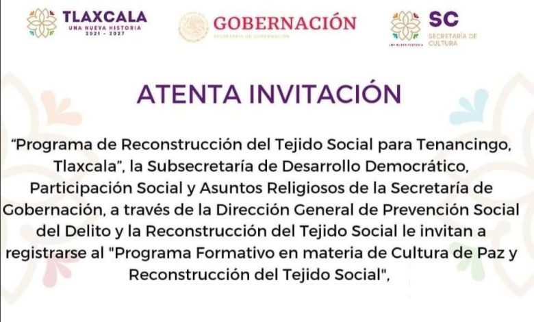 En el marco del “Programa de Reconstrucción del Tejido Social para Tenancingo, Tlaxcala”, la Subsecretaría de Desarrollo Democrático, Participación Social y Asuntos Religiosos de la Secretaría de Gobernación, a través de la Dirección General de Prevención Social del Delito y la Reconstrucción del Tejido Social en coordinación con la Secretaría de Gobernación y de Cultura del estado de Tlaxcala le invitan a registrarse en el «Programa Formativo en materia de Cultura de Paz y Reconstrucción del Tejido Social»