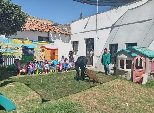 Asimismo, en el preescolar “Cajita Feliz”, se realizó una demostración del grupo K9, donde niñas y niños pudieron interactuar y conocer el trabajo de los binomios caninos, reforzando la confianza y cercanía con los cuerpos de seguridad.
