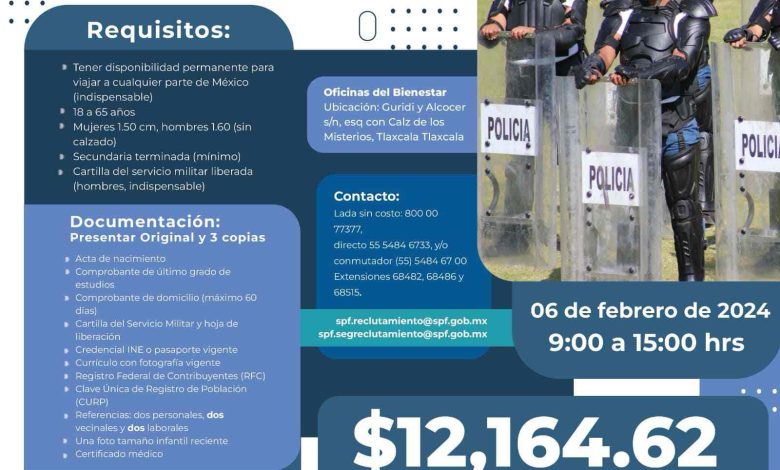 Los agentes del Servicio de Protección Federal realizarán distintas jornadas de reclutamiento en todo el estado, iniciando en las instalaciones de la Delegación de la Secretaría de Bienestar, ubicadas en la calle Miguel Guridi y Alcocer, S/N esquina con Calzada Los Misterios, en la ciudad de Tlaxcala.