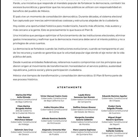 A través de un pronunciamiento conjunto emitido este viernes 13 de marzo de 2026, las y los gobernadores destacaron que esta iniciativa responde al mandato popular de mejorar el funcionamiento de las instituciones electorales, reducir excesos burocráticos y acercar el sistema democrático a la ciudadanía.