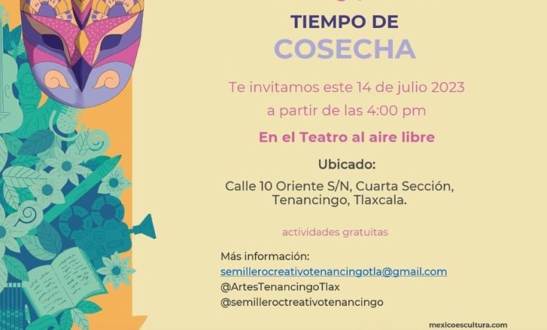 Este Semillero Creativo de Artes Escénicas, que se ha presentado en escenarios nacionales e internacionales, presenta «Tiempo de Cosecha», el próximo 14 de julio a partir de las 4:00 pm, en el Teatro al Aire Libre, ubicado en la Calle 10 Oriente S/N, Cuarta Sección, en Tenancingo, Tlaxcala. Entrada Gratuita.