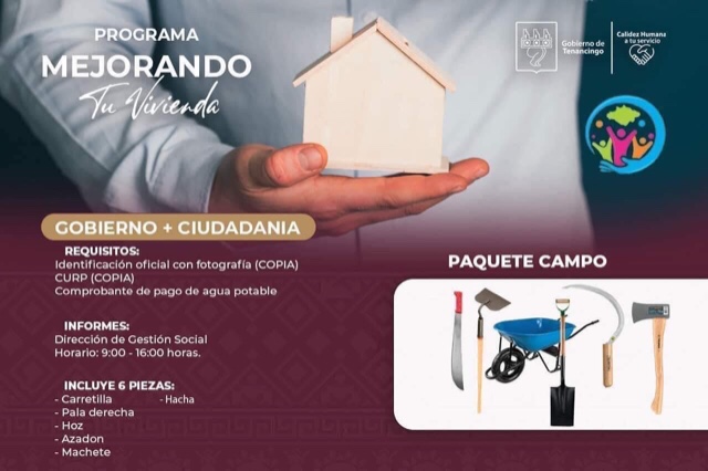 Marina Valencia | ZRST | Tlax Jun 2023.- El Gobierno Municipal de Tenancingo, Tlaxcala, en colaboración con la fundación Por Un Mejor Tlaxcala, se complace en invitar a la comunidad a adquirir el paquete campo, compuesto por una carretilla, una pala, una hoz, machete, hacha y azadón. Esta iniciativa tiene como objetivo brindar herramientas y equipos básicos para fomentar la agricultura y el trabajo en el campo, promoviendo así el desarrollo rural y mejorando la calidad de vida de los habitantes de la región.