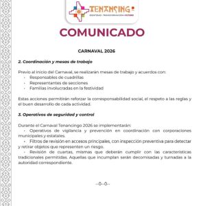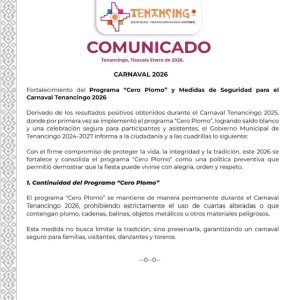 Luis Alfredo Pérez | ZRST | Tlax Ene 2025.- Con el objetivo de preservar la tradición y garantizar la seguridad de participantes y asistentes, el Gobierno Municipal de Tenancingo, Tlaxcala, que es encabeza por el alcalde Emmanuel Contreras Corona, dio a conocer el comunicado oficial sobre el Carnaval Tenancingo 2026, en el que anuncia el fortalecimiento del programa “Cero Plomo” y la implementación de diversas acciones preventivas.
