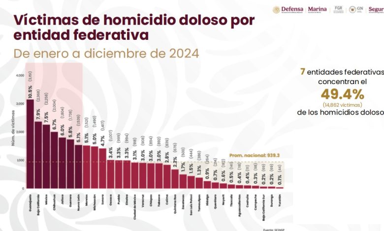 Durante la conferencia mañanera de este 09 de enero, en la que se presentó el informe de resultados en materia de seguridad durante los primeros 100 días de gobierno de la presidenta Claudia Sheinbaum, se dio a conocer el registro de homicidio doloso en cada una de las 32 entidades federativas durante el año pasado.