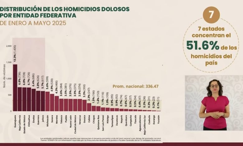 Dicho reporte indica también que siete entidades concentran el 51.6 por ciento de los homicidios del país: Guanajuato (mil 435), Baja California (736), Estado de México (728), Chihuahua (726), Sinaloa (686), Guerrero (626) y Jalisco (617).