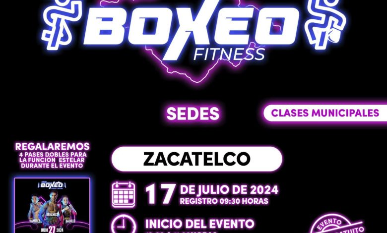 Zacatelco, Tlax. Jul 2024.- El próximo miércoles 17 de julio, el municipio de Zacatelco será el escenario de una sesión gratuita y masiva de Boxeo Fitness. El evento se llevará a cabo a partir de las 10 de la mañana en el Polideportivo de Zacatelco, ubicado en la calle Prolongación Carril Puebla-Tlaxcala, barrio de Tlatlacola, Primera Sección del municipio. Esta actividad es organizada por el Instituto del Deporte de Tlaxcala (IDET) en coordinación con el Cabildo de Zacatelco, a través de la Dirección de Educación y Deporte.